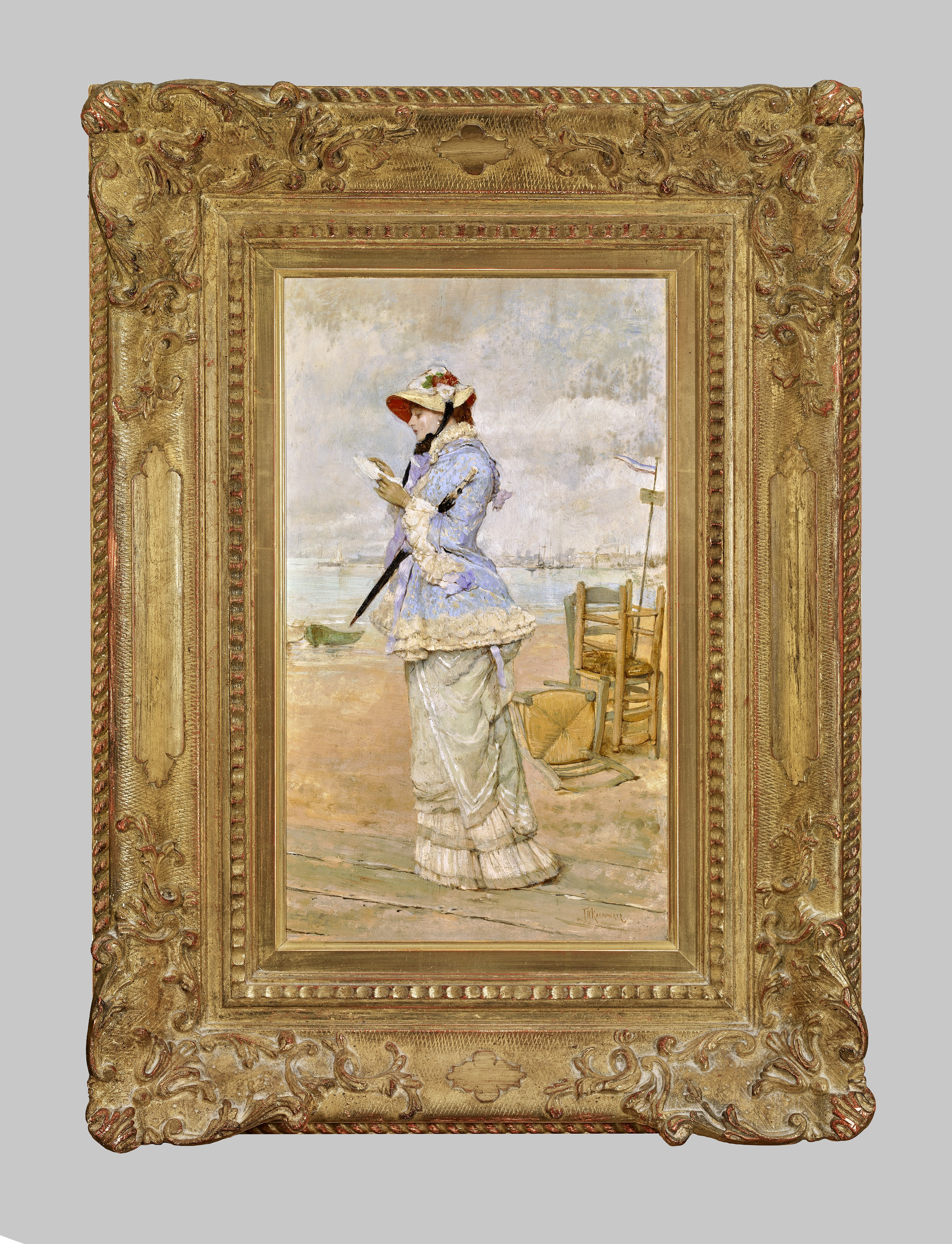 The highly skilled technicality of the composition, its charm and attention to detail are probably elements Kaemmerer learned at the studio of his master Jean-Léon Gérôme. An upper-class vacationer strolling on the boardwalk occupies the center of the composition. Set against an overcast and empty beach, she is fully absorbed in her letter. Her un-posed casualness, as if captured in a snapshot photograph, characterizes Kaemmerer’s unique style. She is also very modern. In addition to being educated, as symbolized by the letter in her gloved hands, she is wearing the latest fashion. Her style of dress, which consists of a pouf at the back, accentuated by a draped over-skirt, was very popular at the end of the 19th century.
