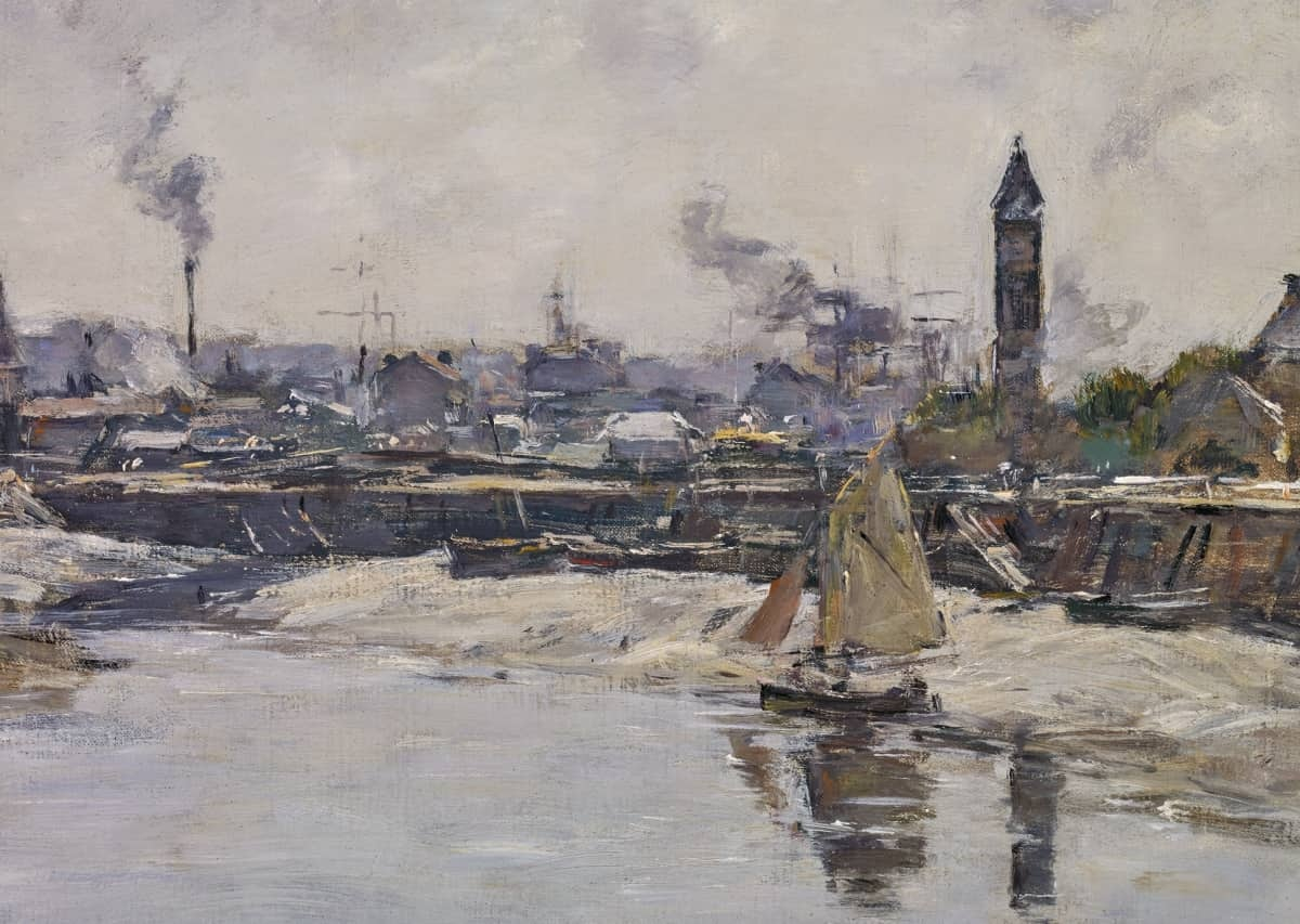 Boudin has painted a winter morning in Trouville, the harbor showing evidence of a recent snowfall. The changing seasons along the Normandy Coast provided varying tableaus for the plein air painters, who called this region home on-and-off during the second half of the 19th century. For Eugène Boudin, who was born here, the Channel coast with its waters and skies held great personal significance. He had known the region before tourism arrived; before fishing cottages were replaced by bathing cabanas, restaurants and hotels. Yet, when we think of Boudin’s most memorable paintings, what immediately comes to mind are his beach scenes crowded with fashionable vacationers, or his crinolines. While he may have enjoyed the greater variation in color on his palette that these pictures required, it is likely with mixed feelings that Boudin painted these subjects. He wrote to a friend that these beach crowds seemed like “a frightful masquerade.” Thankfully for him, he still recognized that “the Creator [had] spread out everywhere his splendid and warming light, and it is less this society that we reproduce than the element which envelops it.” (quoted in Robert Herbert, Impressionism: Art. Leisure & Parisian Society, New Haven, 1988, p. 268).