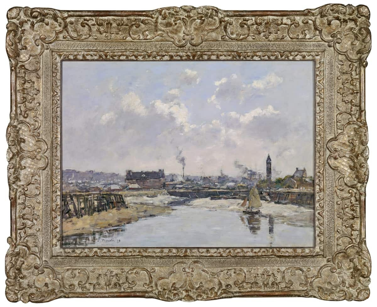 Boudin was awarded a gold medal at the 1889 Exposition Universelle, the year of our painting. He also had recently garnered success in selling some of his paintings to the French State. But, even in the last decade of his career, he continued to be drawn back to his native Trouville, where in his trademark palette of greys and blues, he painted the harbor and the features of village life he had remembered as a young artist.