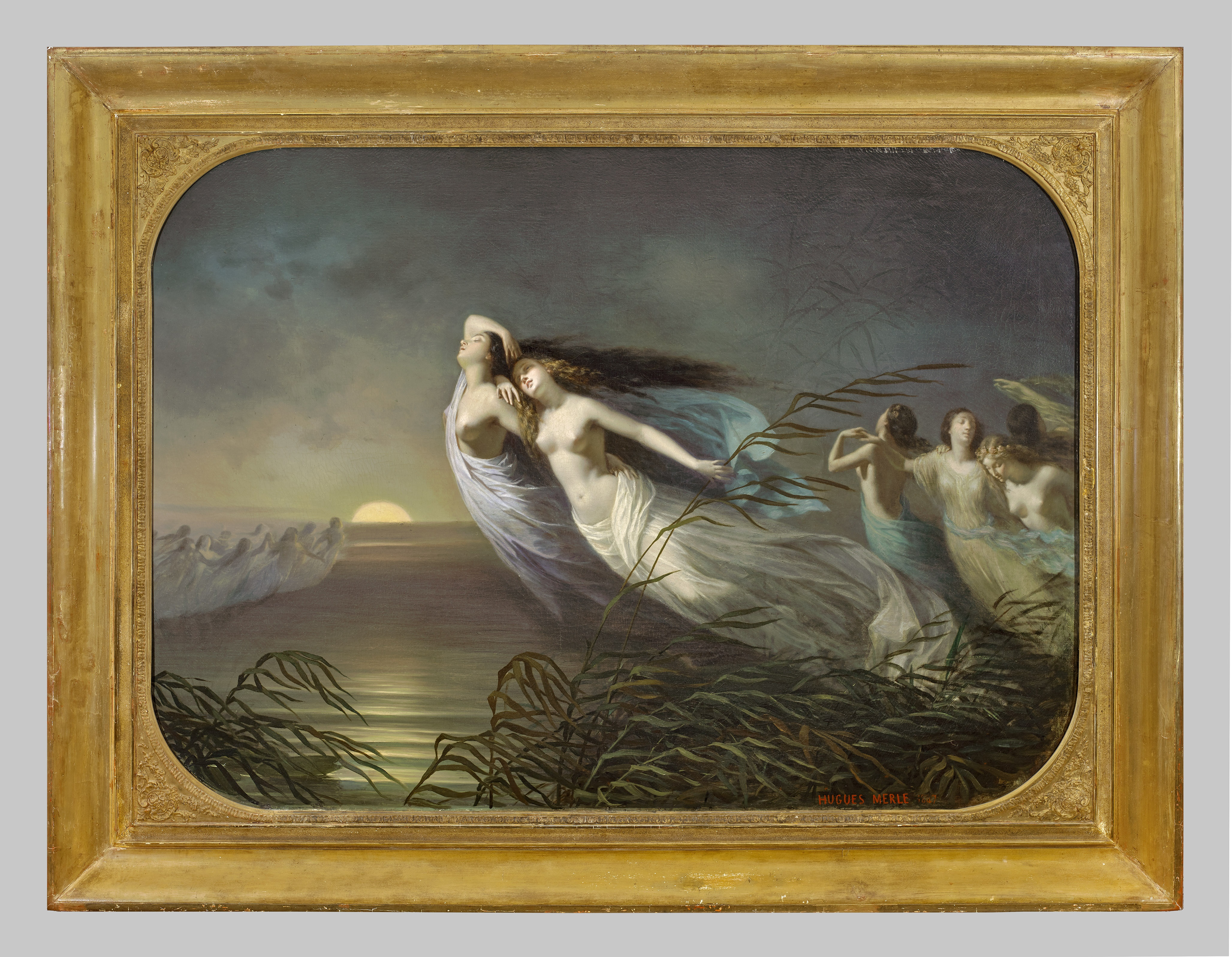 The legend of the Willis (also Wilis) must have been a resonant one among artists and public alike in 1847, the time of Merle’s enchantment with the theme.[4] In that year, Ernest-Auguste Gendron (1817-1881) submitted his own, strikingly similar version to the Salon (no. 745, Les Willes, also called Les Ondines [Bordeaux, Musée des Beaux-Arts]), to widespread praise and attention. (Among the admirers was Théophile Gautier [1811-1872].) Gendron’s painting was undoubtedly inspired by the most famous adaptation of the theme, Alphonse Adam’s 1841 ballet Giselle. (Adam composed the music for the performance, while Jean Coralli [1779-1854] and Jules Perrot [1710-1792] created the choreography. The enormously popular ballet was performed for the first time by the Ballet du Théâtre de l’Académie Royale de Musique at the Salle Le Peletier in Paris, with Carlotta Grisi dancing the title role.) Here, and for the first time, the composer referred to the women in the performance as “naked,” a description that Gendron clearly took to heart in the development of his composition. Merle’s picture exhibits a slightly different interpretation, drawn perhaps from the prose description of the German poet and literary critic Heinrich Heine (1797-1856) in his De l’Allemagne of some years before. (Published in French and widely disseminated, this popular passage had also inspired Gautier to co-author Adam’s version of the ballet.) Here Heine writes,
