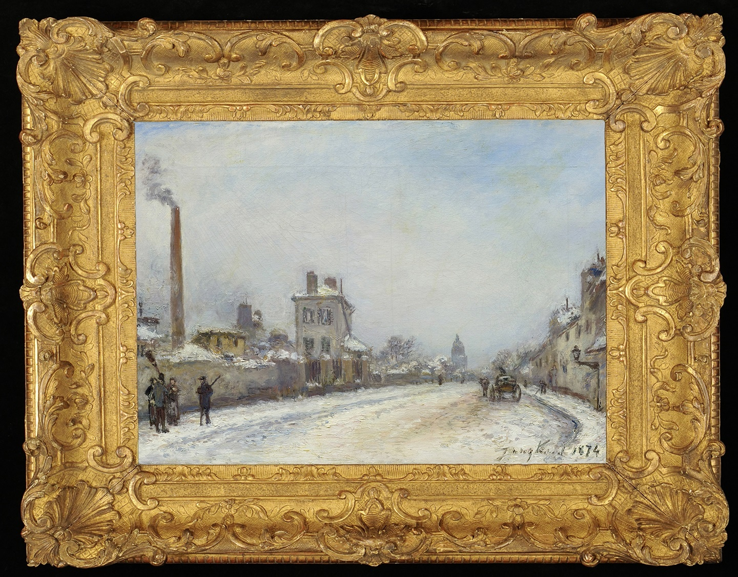 Jongkind painted other urban winter scenes as well (cf. Boulevard des Invalides sous la neige, Paris, 1878, oil on canvas, 9 ¾ x 12 ⅘ in. [24.7 x 32.7 cm], Musée Faure, Aix-les-Bains).